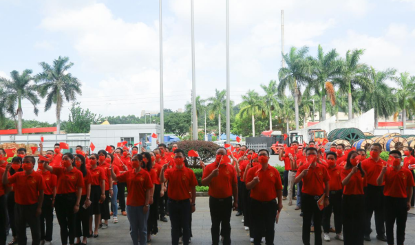 盛夏七月,热情似火!金世豪公司已是党旗飘扬,处处洋溢着喜庆祥和的气氛。当日上午,身穿“中国红”T恤的党员等参会人员有序入场,列队数字“100”庆祝图案,表达对中国共产党的无限热爱。随着主持人一声令下,伴随着激昂雄壮的国歌声,护旗手奋力将鲜艳的五星红旗抛向天空,国旗迎着清晨第一缕阳光冉冉升起,全体人员庄重注视国旗,高唱国歌,脸上写满了骄傲与自豪。